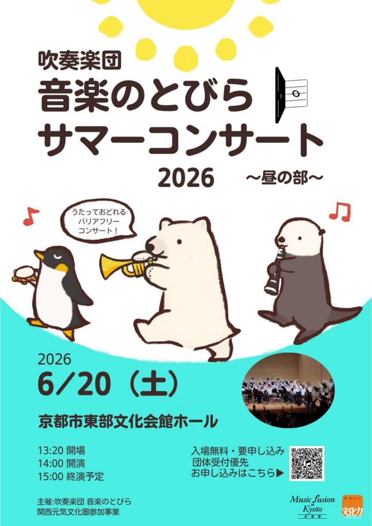 2026年4月16日 / 最終更新日時 : 2026年4月16日 S.T 演奏会情報 サマーコンサート2026 ~昼の部~ 公演名サマーコンサート2026 ~昼の部~日付2026年6月20日(土)時刻開場13:30 開演14:00会場京都市東部文化会館 ホール(京都市山科区椥辻西浦町1番地の8)入場料無料(要申し込み、先着順)団体は広告協賛費を頂戴します。プログラムおたのしみ公演時間約70分 申込フォーム FacebookXBlueskyHatenaCopy